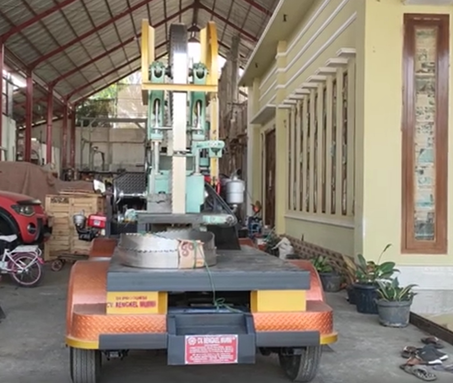Menggunakan penggerak diesel atau bensin yang kuat, serta rel dan meja potong yang stabil, Band Saw Mobil buatan CV. Bengkel Murni sangat cocok untuk industri pengolahan kayu skala menengah hingga besar.